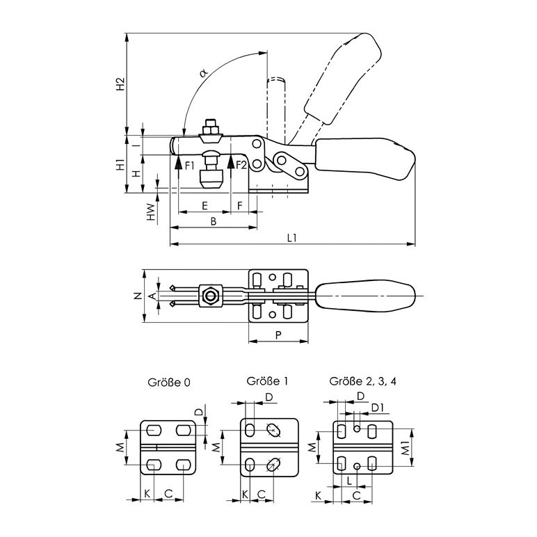 VA · mit waagrechtem Fuß · poliert · Niete bei den Größen 2 bis 5 in Lagerbuchsen laufend · Lagerstellen gefettet · ergonomischer, ölbeständiger Handgriff mit großer Handauflage und weicher Komponente · Verliersicherung für die Andrückschraube am Spannarm-Ende · komplett mit nicht rostender Andrückschraube Nr. 6890NI · auch für die Lebensmittelindustrie geeignetWeitere technische Eigenschaften:· A: 8mm· C: 25,7mm· D: 6,5mm· Andrückschraube: M8 x 45· HW min.: -2mm· L1: 206mm· HW max.: 9mm· H1: 48,5mm· F1: 1,8kN· H2: 86mm· L: 13mm· M1: 31,6· a*: 90°· Material: Edelstahl· Bauart: waagrechter Fuß· I: 15mm· F2: 2,5kN· F: 14mm· B: 73mm· P: 50mm· K: 7mm· E: 36mm· M: 22-31,8mm· H: 32mm· N: 44,5mm· D1: 5,1mm