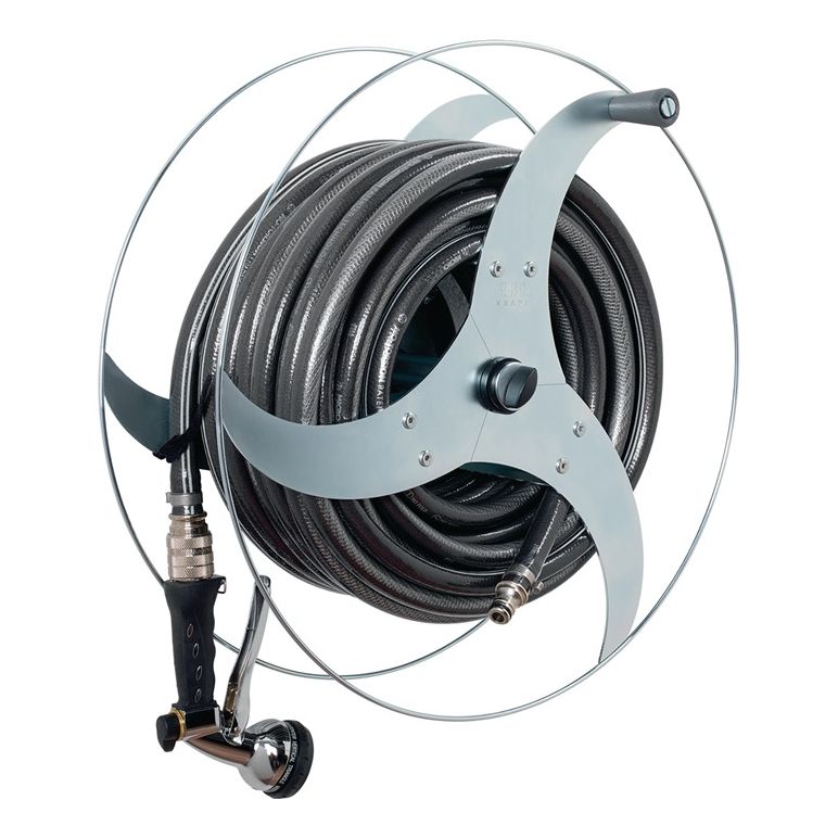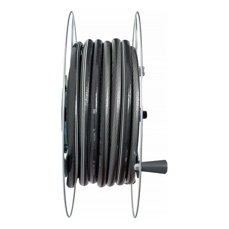 einfache Montage · schnelle Bedienung · aus langlebigen und umweltfreundlichen Materialien · einzigartiges und geschütztes Turbo-Design · breite Auflagen schonen den Schlauch · mit einem Wandabstand wie ein gewöhnlicher Schlauchhalter · stabile Wandkonsole für sicheren Halt · mit Abrollbremse · Ø 427 mm · Tiefe 215 mm · Gewicht ohne Schlauch: 3,5 kg