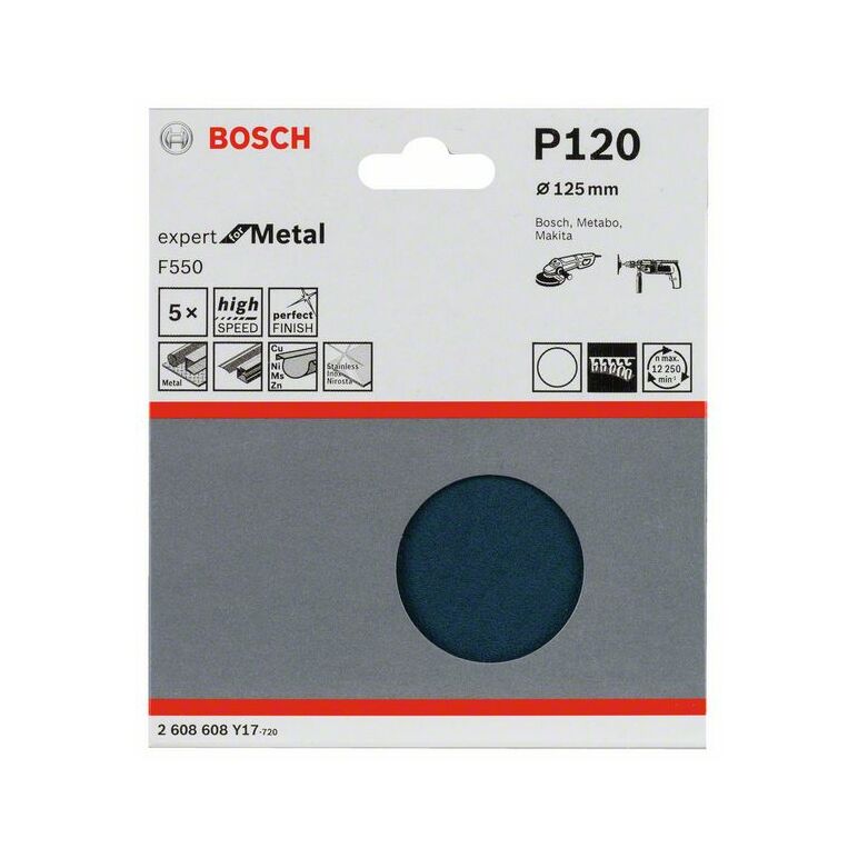 Bosch Schleifblatt F550, Expert for Metal, 125 mm, 120, ungelocht, Klett, 5er-Pack (2 608 608 Y17)
