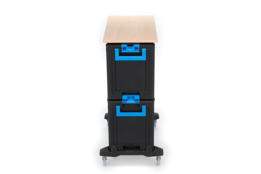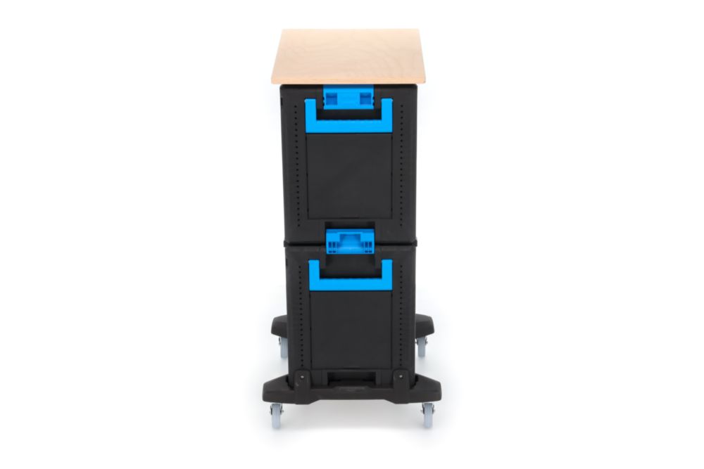 Arbeitsplattform mit Abdeckung aus ABS-Kunststoff mit frontaler Abflachung und Rollschutzkante, sowie kleinen zusätzlichen Ablagefächern, Dosen- und Schraubendreherhalter