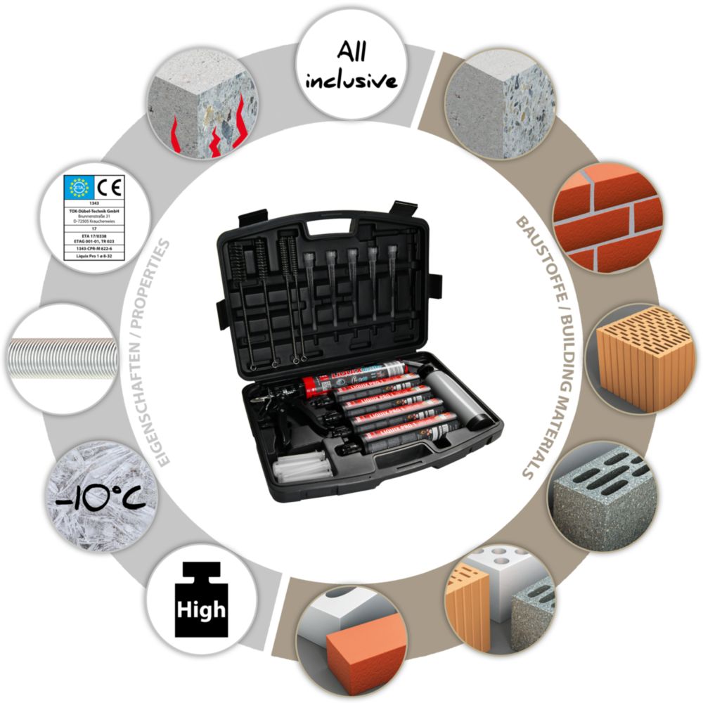 Dieses Komplett-Set beinhaltet neben dem Verbundmörtel alles zur Verarbeitung: