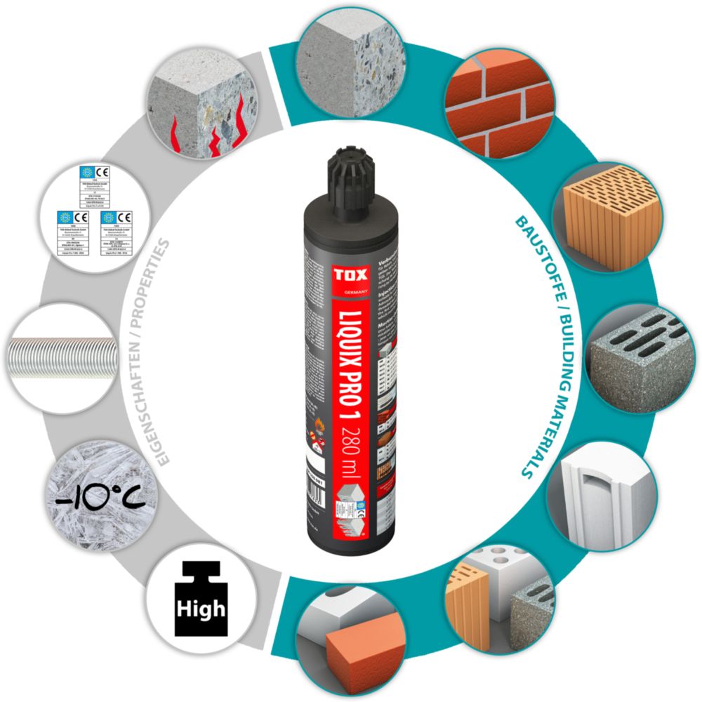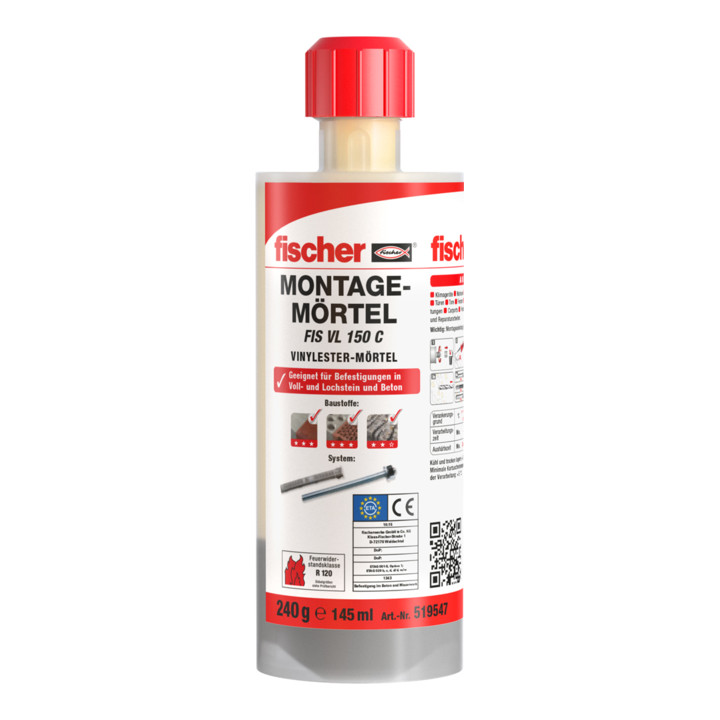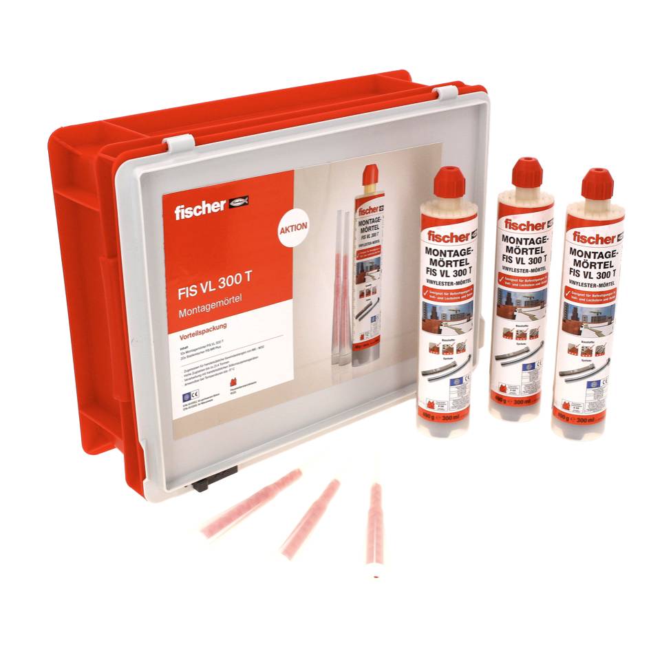 Die Fischer Montagemörtel FIS VL 300 T ist ein 2K Injektionssystem auf Vinylesterbasis. Dabei werden die Harze und Härter erst beim Auspressen aus dem Statikmischer vermischt und aktiviert. Mit einer handelsüblichen Dichtstoff Auspresspistole kann der Mörtel besonders effizient und sparsam aufgetragen werden ( nicht im Lieferumfang enthalten! ). Der Fischer Montagemörtel ist für Standardaufgaben in Voll- und Lochsteinmauerwerk und in gerissenem Beton ausgelegt. Das Hybrid-System bietet mit zugelassenen Systemkomponenten wie Ankerstangen FIS A, Innengewindeankern und Injektions-Ankerhülsen für Befestigungen in Beton und Mauerwerk viele Anwendungsmöglichkeiten im Innen- und Außenbereich. Der Zementanteil sorgt für eine gute Beständigkeit bei Temperaturen von -40 bis +120 °C. Angebrochene Kartuschen können problemlos mit einem neuen Statikmischer wiederverwendet werden. Das Ganze gibt's im im praktischen und stapelbaren Fischer Handwerkerkoffer. Bitte beachten Sie zur Anwendung die Gebrauchs- und Warnhinweise des Herstellers.
