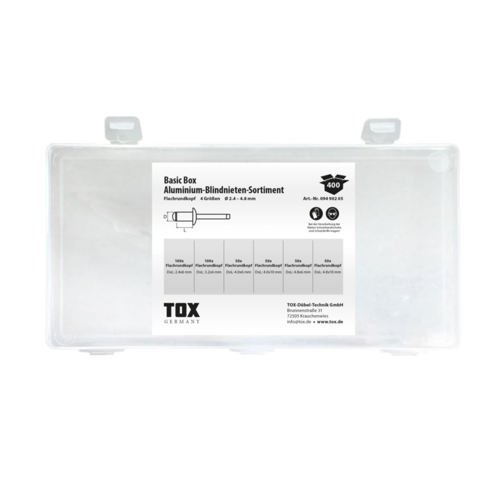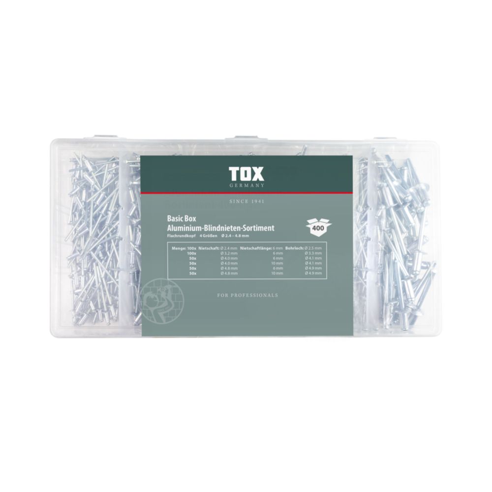 TOX Blindnieten-Sortiment aus Aluminium, Blindnieten mit Flachrundkopf in 6 Größen 2,4x6 mm, 3,2x6 mm, 4x6 mm, 4x10 mm, 4,8x6 mm, 4,8x10 mm, zur Befestigung von Alu- u. Stahlblechen, 400-tlg., 09490205