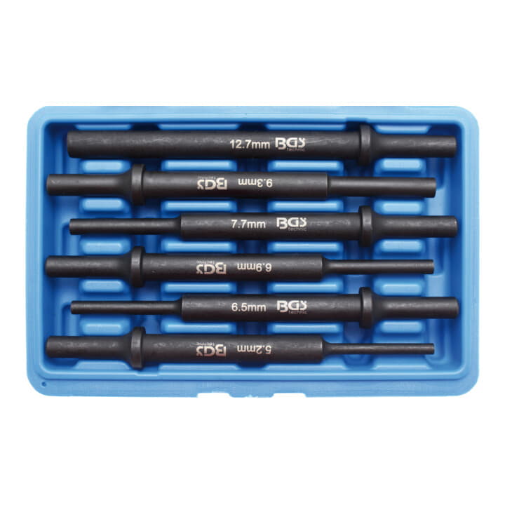 GRUNDAUSSTATTUNG: Das Set umfasst sechs verschiedene Durchtreiber zum Ein- oder Austreiben von Splinten, Federstiften, Bolzen oder anderen Verbindungselementen. Ein PVC-Halter dient der Aufbewahrung.