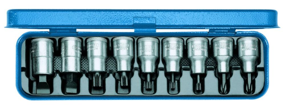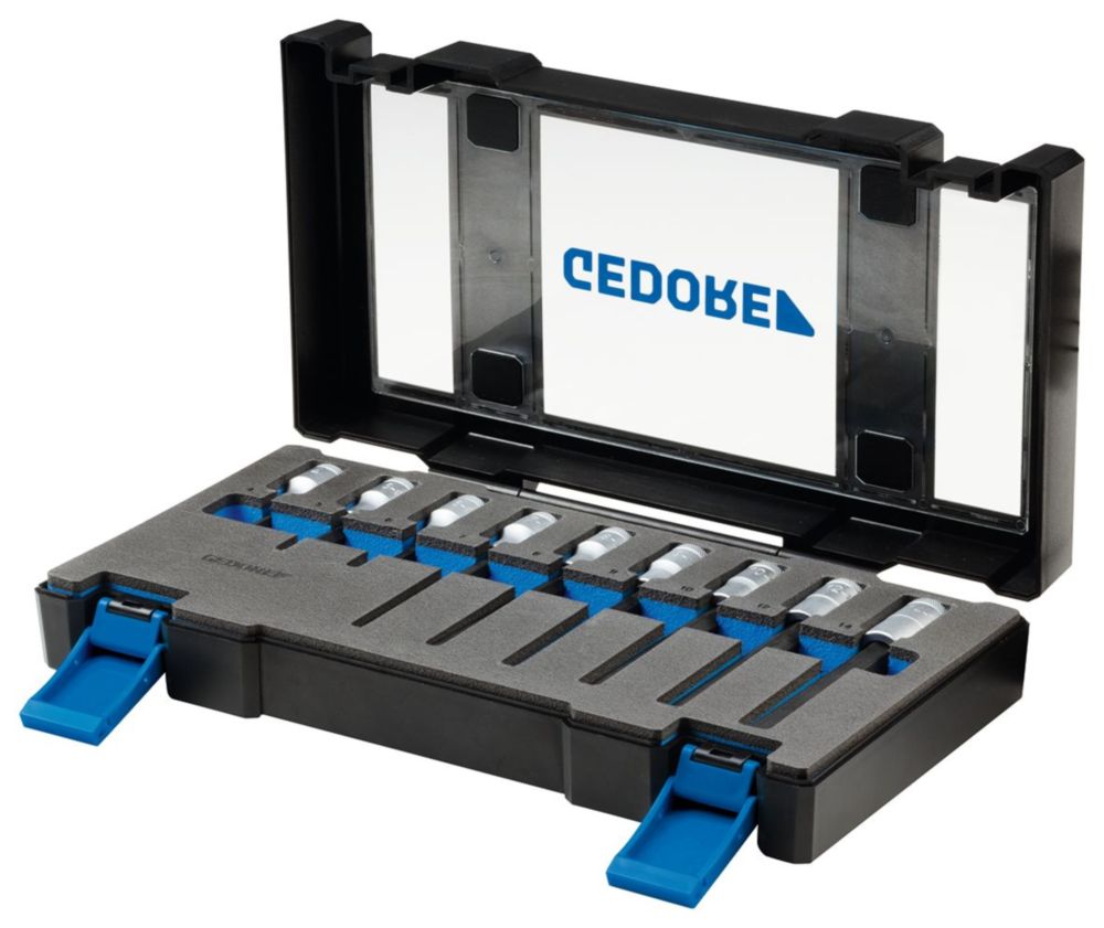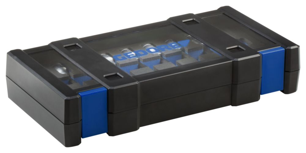 SICHERE AUFBEWAHRUNG: Der blaue GEDORE Stahlblechkasten sorgt für eine sichere und ordentliche Aufbewahrung des 9-teiligen Einsatz-Sets, sodass die Einsätze nicht verloren gehen.