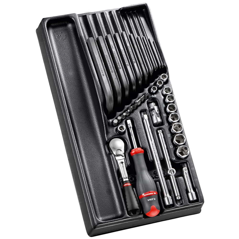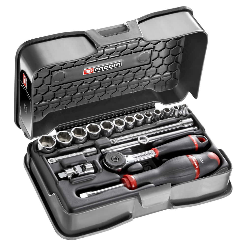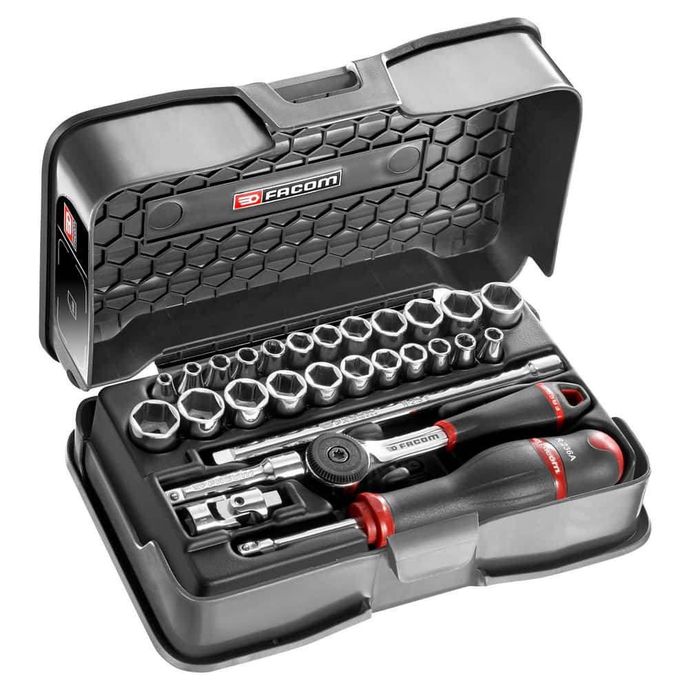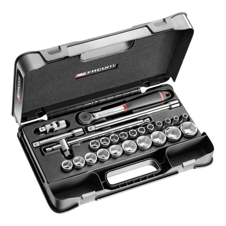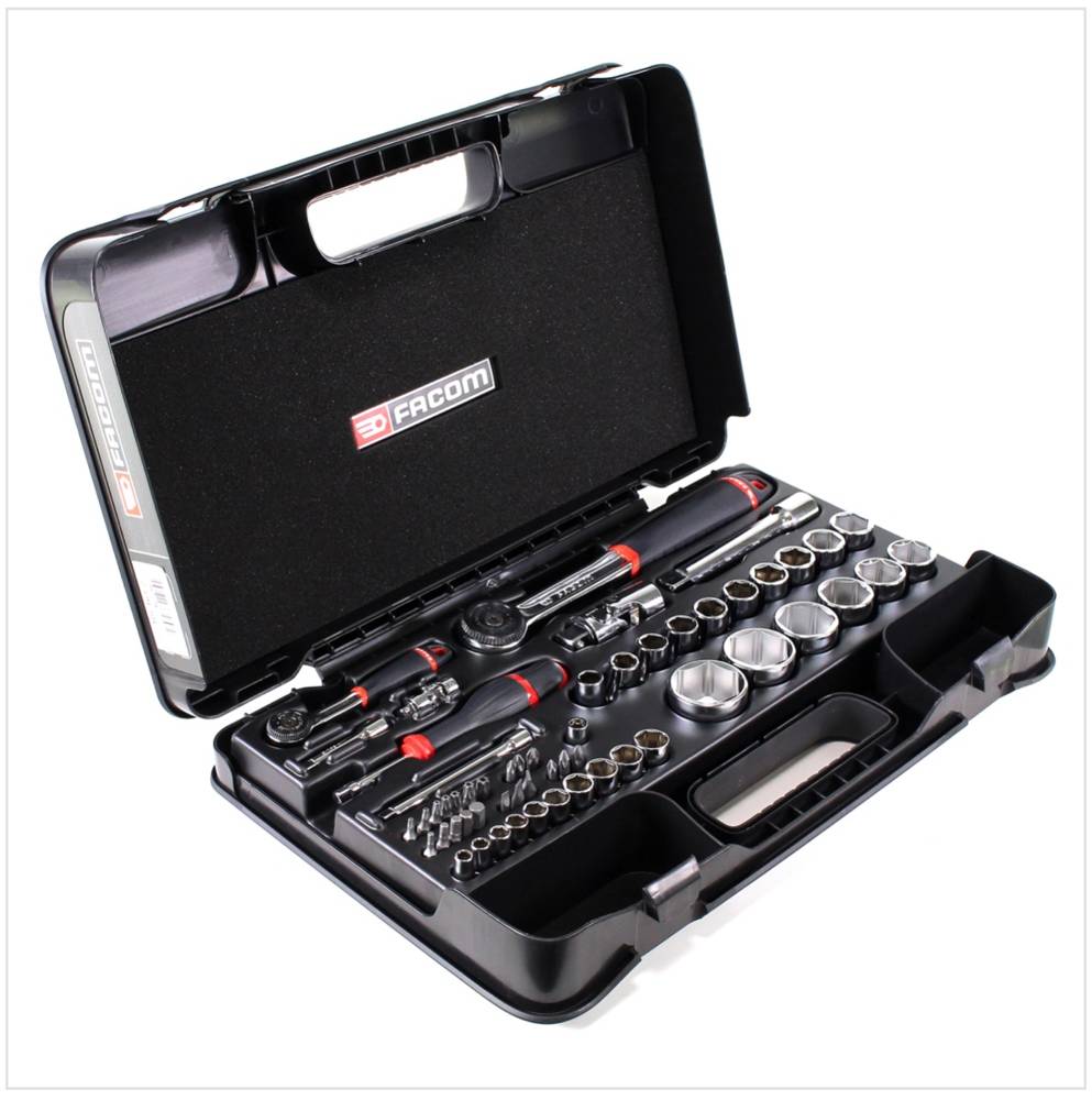 Der Facom RS.161-2 Knarrenkasten ist ein 55-teiliges Steckschlüssel - Set und der Nachfolger des RS 440 E Sets von Facom. Verbessert wurden für das neue Set vor allem die beiden Knarren, die jetzt flacher und zugleich 10% robuster sind. Die Knarren sind mit innenliegenden Dichtungen ausgestattet, die das Eindringen von Schmutz verhindern, zudem wurde ein IP51 Zertifikat erreicht. Im Kasten enthalten sind allerlei Bits, für Torx, für Innensechskant, für Schlitzschrauben und für Kreuzschlitz in verschiedenen Größen, sowie diverse Stecknüsse und praktische Verlängerungen. Verpackt ist das Set in einem praktischen und robusten Facom Kasten mit herausnehmbaren Modul für passend in die gängigsten Werkstattwägen.