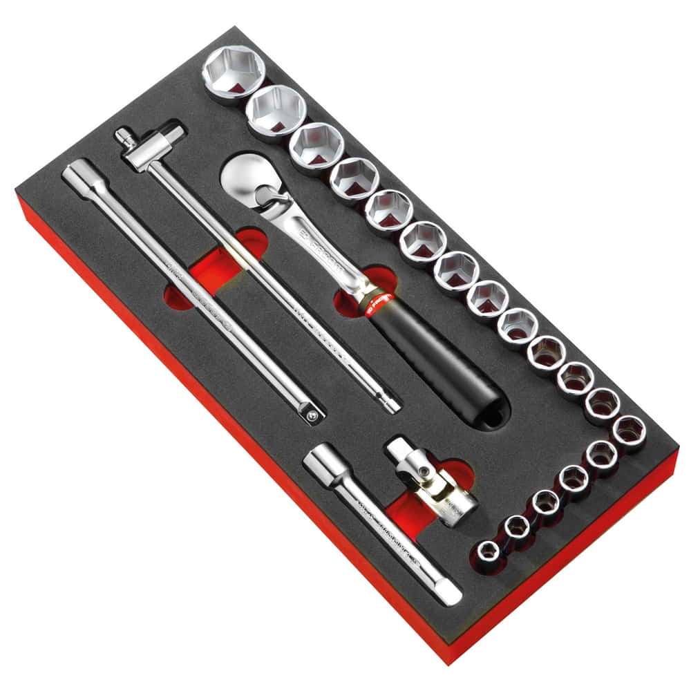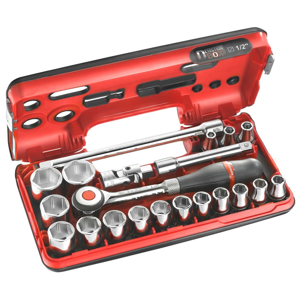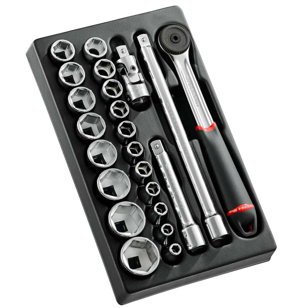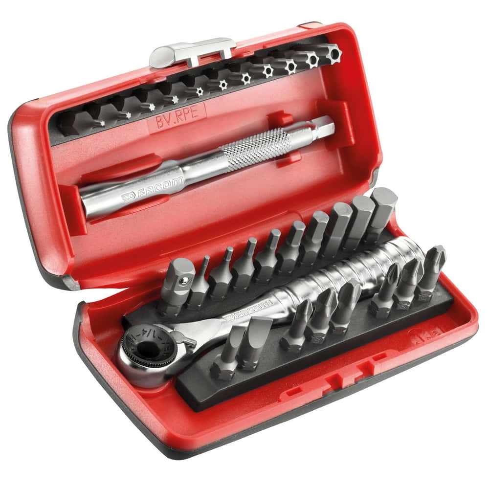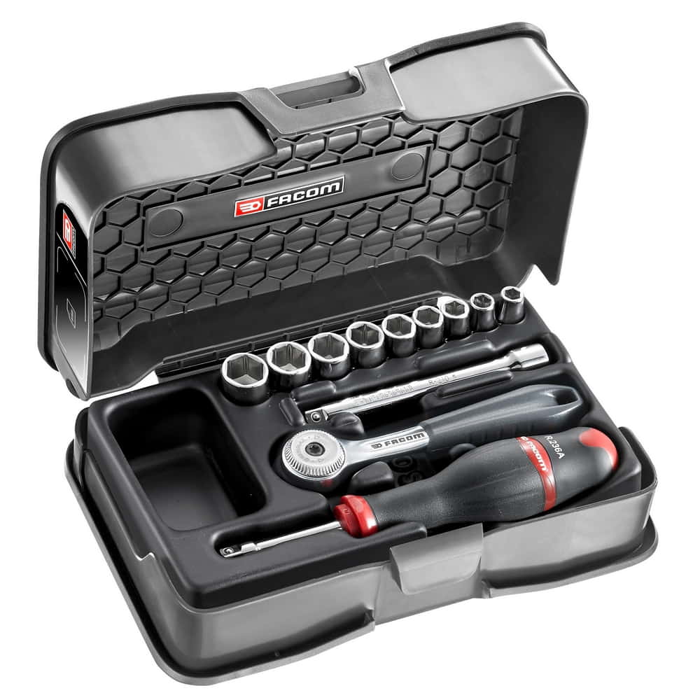 Der Facom RS.161-2 Knarrenkasten ist ein 55-teiliges Steckschlüssel - Set und der Nachfolger des RS 440 E Sets von Facom. Verbessert wurden für das neue Set vor allem die beiden Knarren, die jetzt flacher und zugleich 10% robuster sind. Die Knarren sind mit innenliegenden Dichtungen ausgestattet, die das Eindringen von Schmutz verhindern, zudem wurde ein IP51 Zertifikat erreicht. Im Kasten enthalten sind allerlei Bits, für Torx, für Innensechskant, für Schlitzschrauben und für Kreuzschlitz in verschiedenen Größen, sowie diverse Stecknüsse und praktische Verlängerungen. Verpackt ist das Set in einem praktischen und robusten Facom Kasten mit herausnehmbaren Modul für passend in die gängigsten Werkstattwägen.