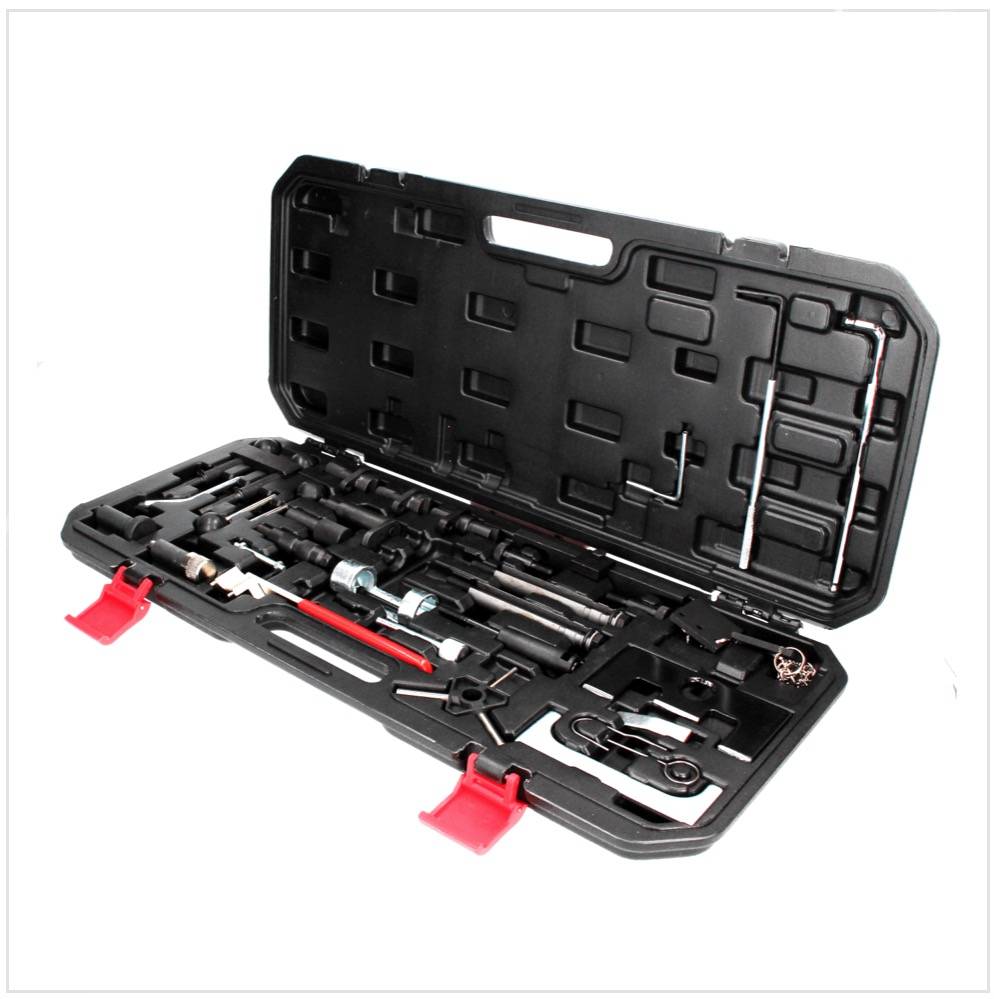 Das 35 teilige Motor Einstellwerkzeug Set von BGS technic bietet eine breite Palette an Einstellwerkzeugen für diverse Motoren aus dem VAG Konzern ( Audi / Seat / Skoda / Volkswagen ). Ob Nockenwelle, Kurbelwelle, Einspirtzpumpe oder Einspritzdüsen: mit diesem Satz kann man die Motorsteuerzeiten bei einem Zahnriemen / Steuerkettenwechsel . Dabei ist der Werkzeug Satz für folgende Motoren aus dem VAG Konzern geeignet: 1.9/2.0 TDI Pumpe/Düse; 1.9 TDI (konventionelle Diesel); 2.5 V6-TDI (nicht Benziner); 3.3 V8-TDI (nicht Benziner); 1.2 3-Zylinder und 1.4/1.6L Benziner. BGS technic ist ein führender Hersteller für Handwerkzeuge und KFZ-Spezialwerkzeuge, eine hohe Verarbeitungsqualität und lange Tradition zeichnen das Unternehmen aus.