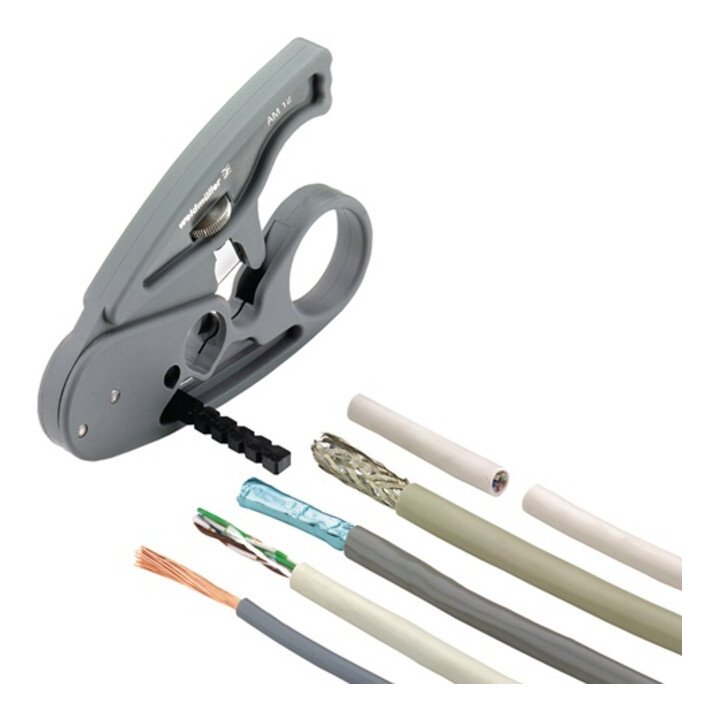 Ausführung: Aus schlagfestem, glasfaserverstärktem Kunststoff, die auswechselbaren Messer passen sich automatisch dem Kabel-Ø an. Mit Längenanschlag 5-15 mm und Seitenschneider bis 2,5 mm².