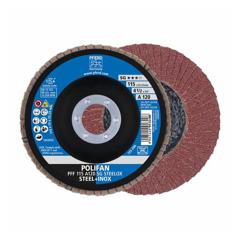 PFERD POLIFAN Fächerscheibe PFF 115x22,23 mm flach A120 Leistungslinie SG STEELOX Stahl/Edelstahl
