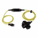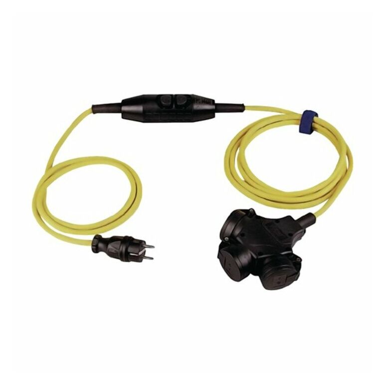 mit Personenschutzschalter und 3-fach-Vollgummikupplung · große, leicht bedienbare Ein-/Austasten · optische Schaltstellungsanzeige · Schutzleiterüberwachung und -erkennung · allpolige Abschaltung · Fremdspannungserkennung · Unterspannungsauslösung · entsprechend DIN VDE 0661, DIN 40040 bzw. DIN EN 60721 Gummischlauchleitung H07RN-F · für den rauen Baustellenbetrieb geeignet · zum ständigen Einsatz im Freien Eingang: Vollgummistecker mit 1,5 m Leitung Ausgang: 3 m Leitung mit 3-fach Vollgummi-Kupplung Weitere technische Eigenschaften: · Schutzart: IP44 · Nennstrom: 16A · prüfpflichtig: ja