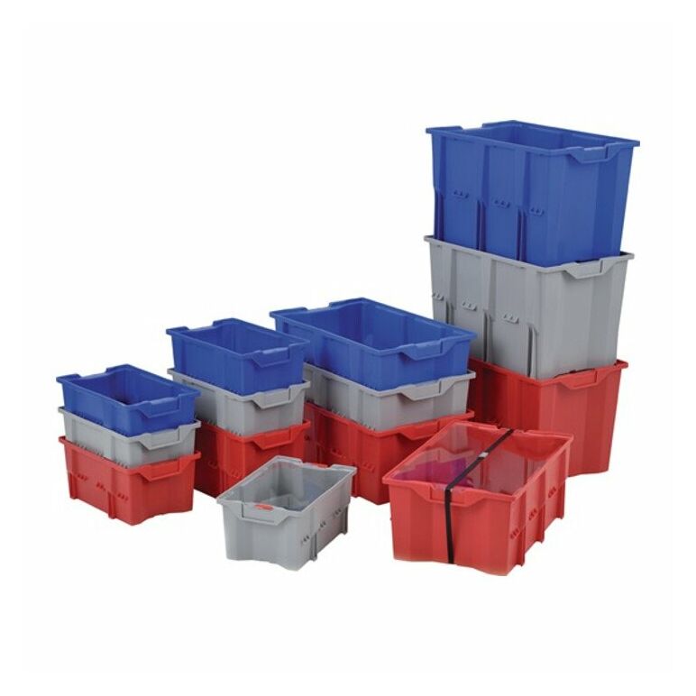 aus Polypropylen · stapelbar · nestbar durch 180° Drehung · mit glattem Boden · für Rollenbahnen geeignet · der Deckel kann durch Plomben oder Spannbänder gesichert werden · lebensmittelecht · temperaturbeständig von - 20 °C bis + 90 °C · beständig gegen Öle, Fette und die meisten Säuren und Laugen · Seitenwände und Boden geschlossen ·
