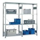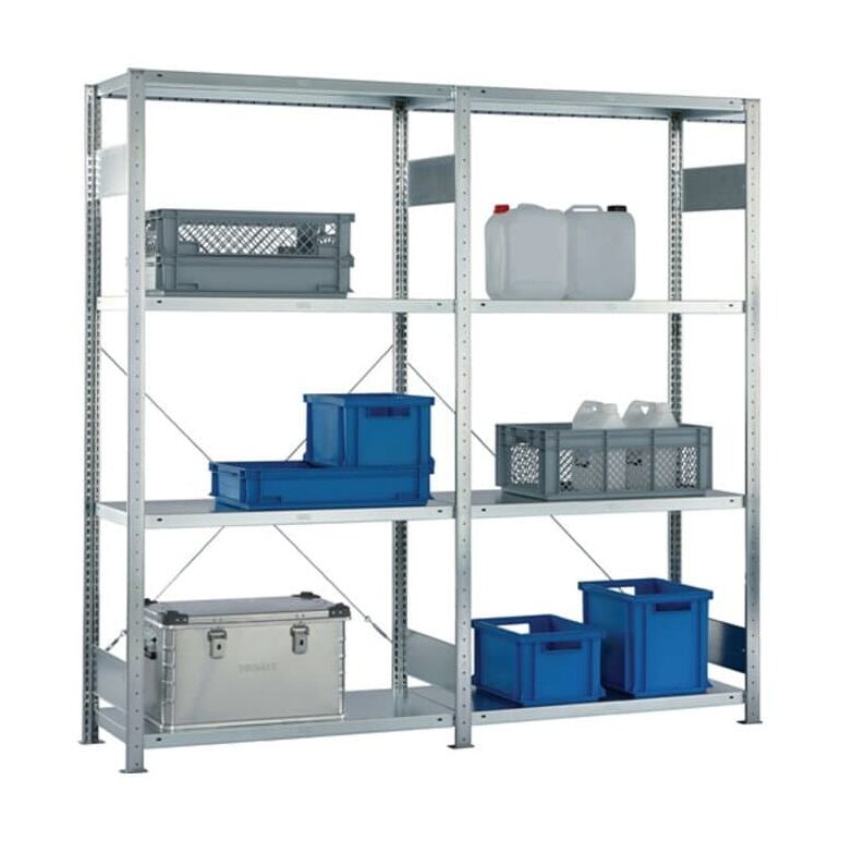 bestehend aus: 1 Grund- und 1 Anbauregal mit jeweils 4 Fachböden · verzinkt · Modulbauweise · schnelle Steckmontage · Fachböden im 25-mm-Raster höhenverstellbar · T-Profilrahmen mit vormontierten Verbindungsblechen · 4 Fachböden mit 150 kg Tragfähigkeit je Boden (bei gleichmäßig verteilter Last), Feldlast 900 kg Regalaußenmaße: Grundregal: Nennlänge + 56 mm Nenntiefe + 36 mm Anbauregal: Nennlänge + 6 mm Nenntiefe + 36 mm Weitere technische Eigenschaften: · Oberfläche: verzinkt