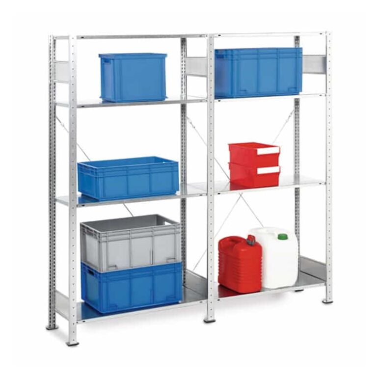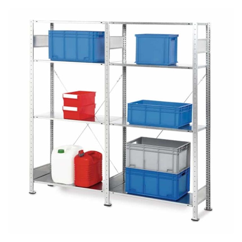 bestehend aus: 1 Grund- und 1 Anbauregal mit jeweils 4 Fachböden · verzinkt · Grund- und Anbauregal in Modulbauweise · einfache und schnelle Steckmontage mit vormontierten verzinkten Rahmen · Fachböden verzinkt mit verstärktem Kastenprofil, H 25 mm, höhenverstellbar im 25-mm-Raster · Tragfähigkeit pro Fachboden 150 kg · Feldlast 1300 kg (bei gleichmäßig verteilter Last) · Regalaußenmaße: Grundregal + 60 mm, Anbauregal + 6 mm, Tiefe + 36 mm Weitere technische Eigenschaften: · Oberfläche: verzinkt