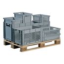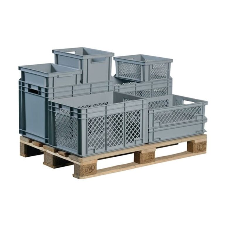 aus Polypropylen · für einen vielseitigen Einsatz im Lager- und Kommissionierbereich · abgestimmt auf Europaletten-Maß · resistent gegen die meisten Säuren und Öle · lebensmittelecht · temperaturbeständig von -20° bis +80° · Farbe grau · Boden geschlossen, Seitenwände durchbrochen Weitere technische Eigenschaften: · Seitenwände: durchbrochen · Innenhöhe: 165mm · Innenlänge: 555mm · Innenbreite: 355mm