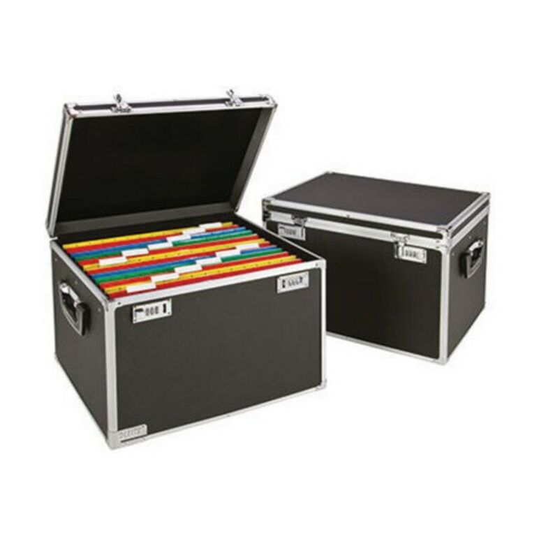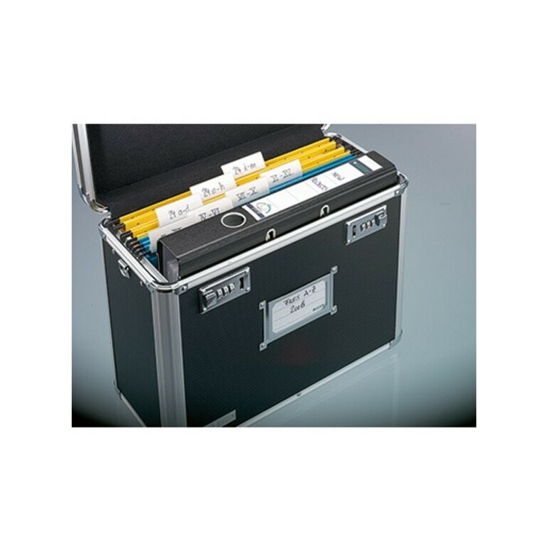 Hängeablage-Box mit Umrandungen aus Aluminium und verstärkte Ecken aus Metall. Mit doppeltem Zahlenschloss, Namensschild und Tragegriff am Deckel.