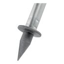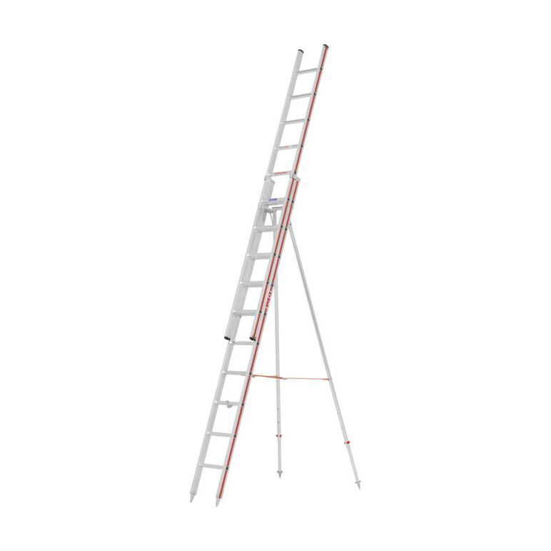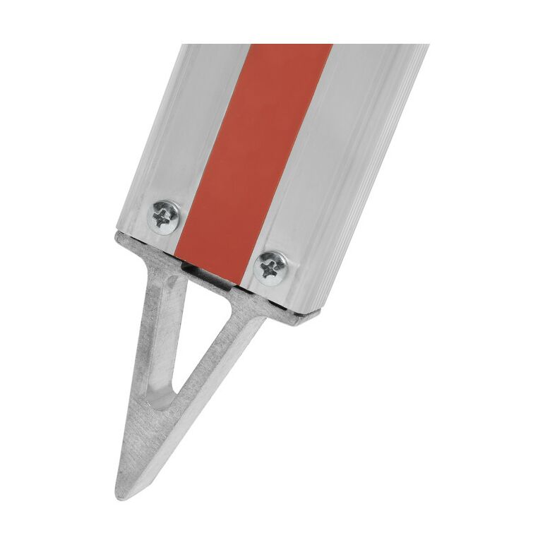 Von Sprosse zu Sprosse verstellbare Schiebeleiter · Unterteil mit geführten Alu-Stützen · Stützen höhenverstellbar · Verstellbereich 280 mm, innerhalb dessen die Stützen im Abstand von 140 mm abgesteckt werden können · Serienmäßig mit 70 mm langen Alu-Spitzen · Spreizsicherung mittels verstellbaren, hochfesten Perlonseilen · Maximale Belastung 100 kg (1,0 kN) · Verwendung nur auf gewachsenem Boden