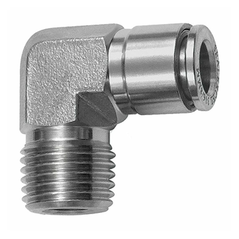 - L-Steckverschraubung, R 1/4 a., für Schlauch-Außen-Ø 10 mm, Arbeitsdruck max. 20 bar, Edelstahl 1.4404. Für den Einsatz in aggressiveren Umgebungen und bei korrosiven Medien