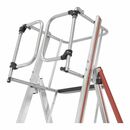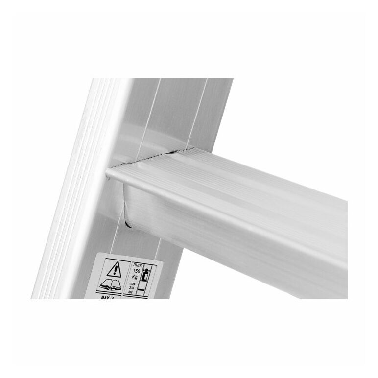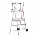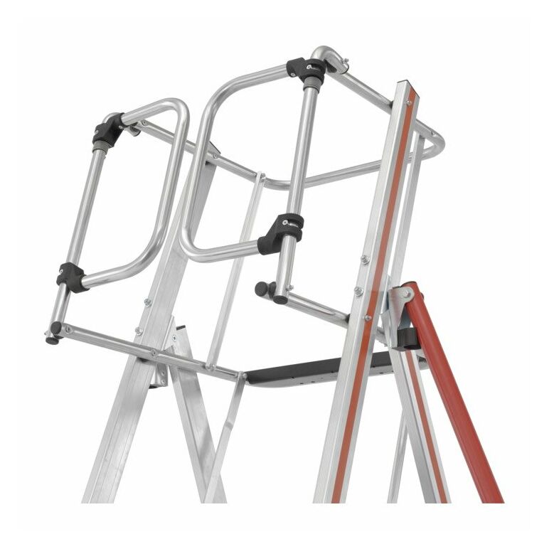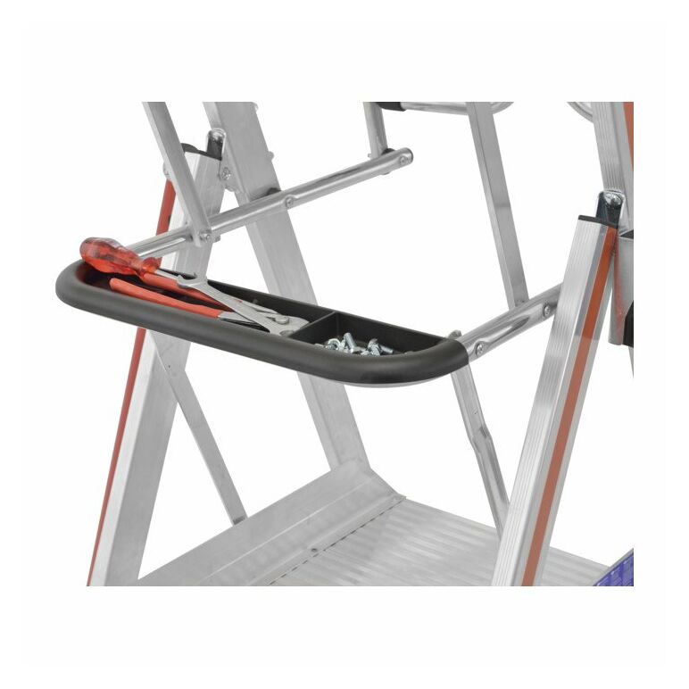 Die erste erweiterbare Plattformleiter · Sicheres, freihändiges Arbeiten durch Geländer und Knieleiste auf allen Seiten · Komfortabler Zugang durch selbstschließende Sicherheitstüre · Praktische Ablageschale, in 2 Höhen montierbar · Geräumige Plattform 600 × 425 mm · Bequemer Aufstieg durch 50 mm tiefe Breitsprossen