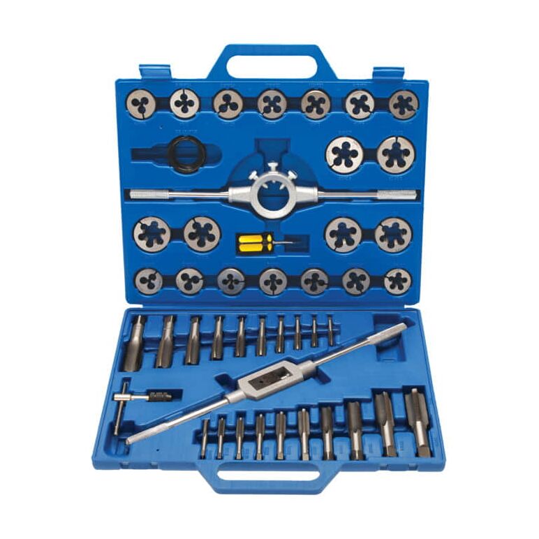 • 20 Gewindebohrer für Innengewinde und 20 Schneideisen für Außengewinde (1x je Größe)