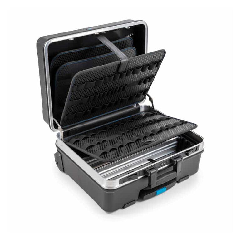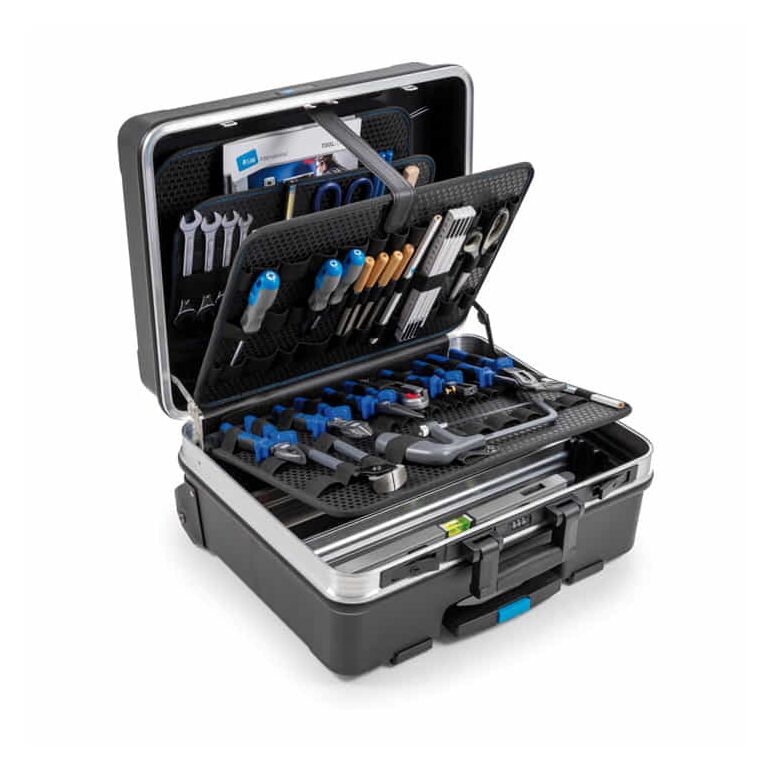 - Ein robuster Aluminiumrahmen mit Stoßkantenschutz schützt das Werkzeug und den Koffer