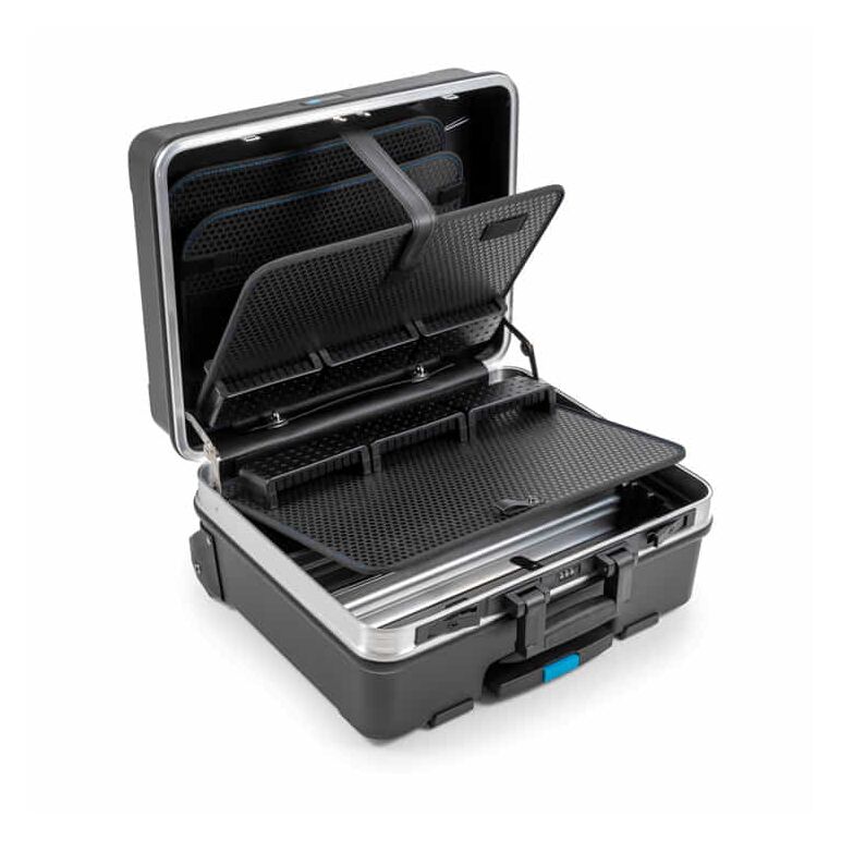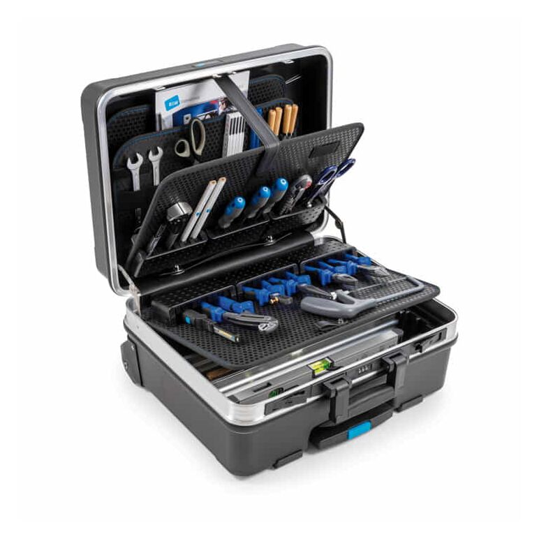 - Ein robuster Aluminiumrahmen mit Stoßkantenschutz schützt das Werkzeug und den Koffer