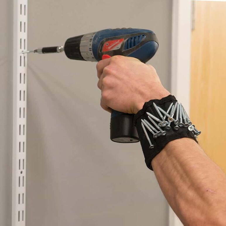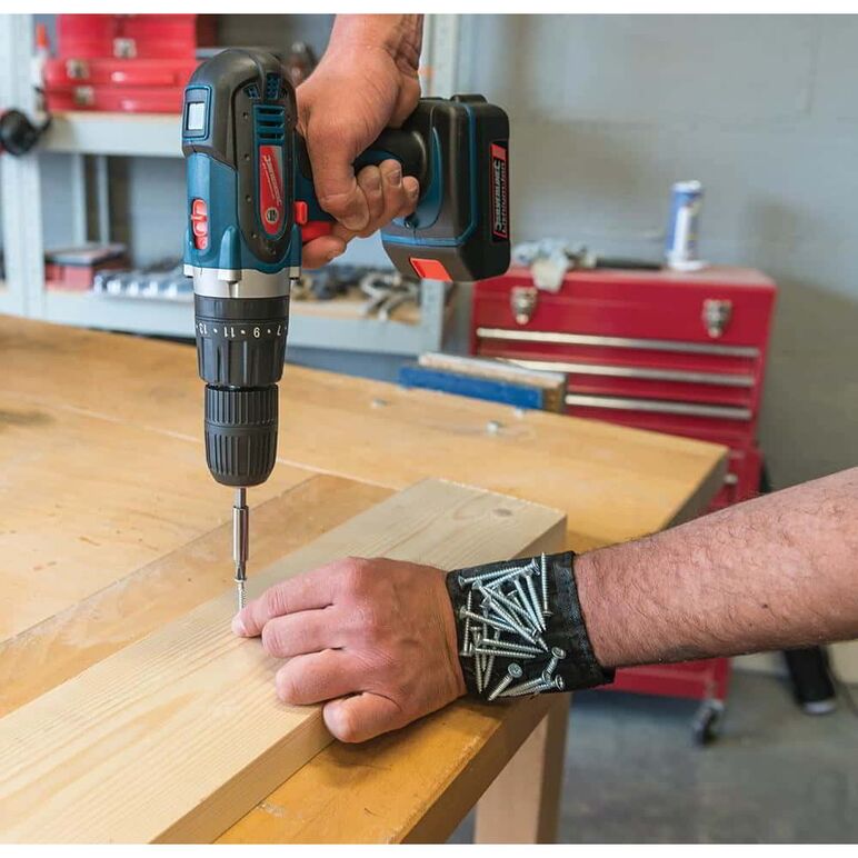 Gewebtes Nylon-Armband mit 16 eingenähten starken Magneten zum Halten kleiner magnetischer Gegenstände, um beide Hände zum Arbeiten frei zu halten. Mit Klettverschluss, damit es an jedes Handgelenk passt. Vier Taschen zum Verstauen von Schraubendreherbits und kleinen Stecknüssen.