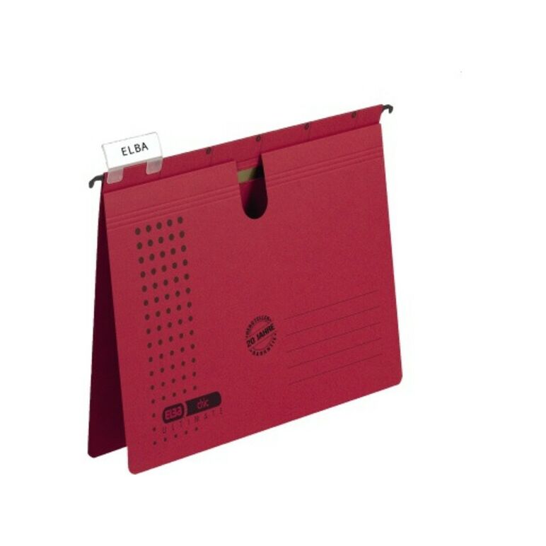 Exklusiver starker Karton verhindert das Ausreißen bei intensivem Gebrauch. Mit Daumenausschnitt · Schnellhefter-Mechanik auf dem Falz. Komfort-Sichtreiter mit aufklappbarer Rückwand und auswechselbarem Beschriftungsschildchen. Extrem steife Metallhängeschiene mit pulverbeschichteten Enden. Beschriftungsmöglichkeit mit ELBA print.