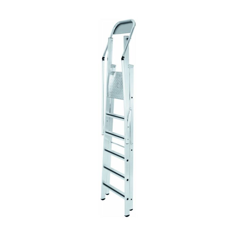 Sicherer Auf- und Abstieg durch rutschsichere Stufen und Handlauf, hohe Standsicherheit und kompakte Transportmaße.
