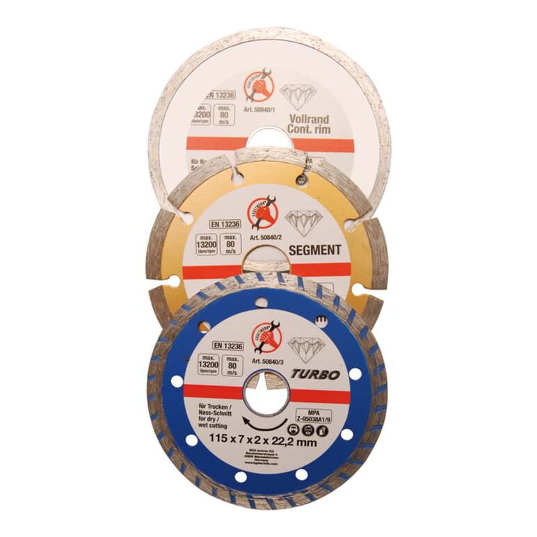 Eigenschaften:Aufnahmebohrung ohne Adapterring: 22,2 mmmit herausnehmbarem Reduzierring: 20 mmLieferumfang:Turbo-Trennscheibe blau, geeignet für trockenes und wassergekühltes SchneidenSegment-Trennscheibe gold, geeignet für trockenes SchneidenVollrand-Trennscheibe silber, geeignet für wassergekühltes Schneiden