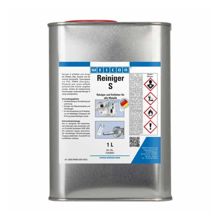 WEICON Reiniger S entfernt ölige und fettige Verschmutzungen von allen Metallen sowie von Keramik, Glas und den meisten Kunststoffen. Er kann jedoch die Oberfläche von Thermoplasten wie PVC, Plexiglas, Polystyrol und einfachen Lackschichten angreifen. WEICON Reiniger S verdunstet schnell und im Gegensatz zu herkömmlichen Verdünnern rückstandsfrei. Er kann zur Reinigung und Entfettung vor dem Grundieren und Lackieren, zur Reinigung von Maschinenteilen oder vor dem Auftragen anderer WEICON Produkte auf Oberflächen eingesetzt werden, wo ein fettiger Untergrund deren Wirkung beeinträchtigen würde. Auch für die Entfettung von Elektromotoren und stark beanspruchten elektronischen Geräten ist Reiniger S eine hervorragende Lösung.