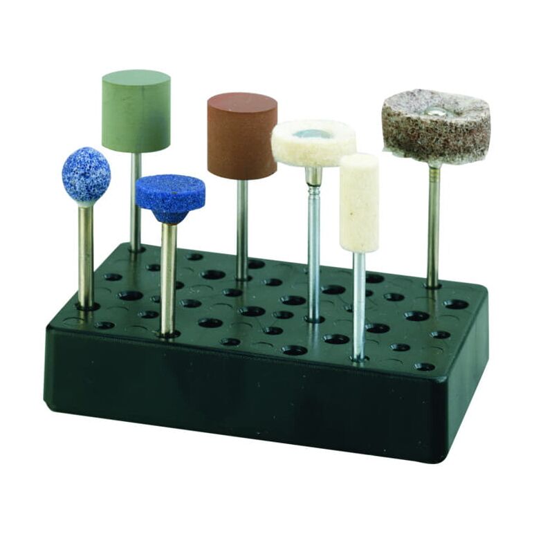 • Zum sauberen Aufbewahren von Microbohrern, Schleifstiften, Bürsten, und sonstigen rotierenden Werkzeugen.
