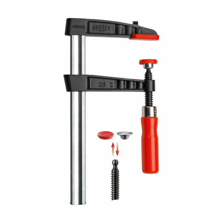 Eigenschaften:Spannkraft bis zu 6.000 NErgonomisch geformter HolzgriffWerkzeuglos wechselbare Druckplatten (ab 80 mm Ausladung)Mit Schutzkappen auf den SpannflächenStabile Hohlprofilschiene mit RiffelungBESSEY Rutschsicherung (ab 80 mm Ausladung)