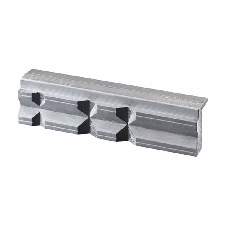 Spannen von Werkstücken in verschiedensten Formen. Die Backen sind aus Aluminium in einer Härte zwischen Kupfer und Blei. Ein waagerechtes Prisma und drei unterschiedlich große, senkrechte Prismen ermöglichen das Spannen von runden und ovalen Werkstücken.