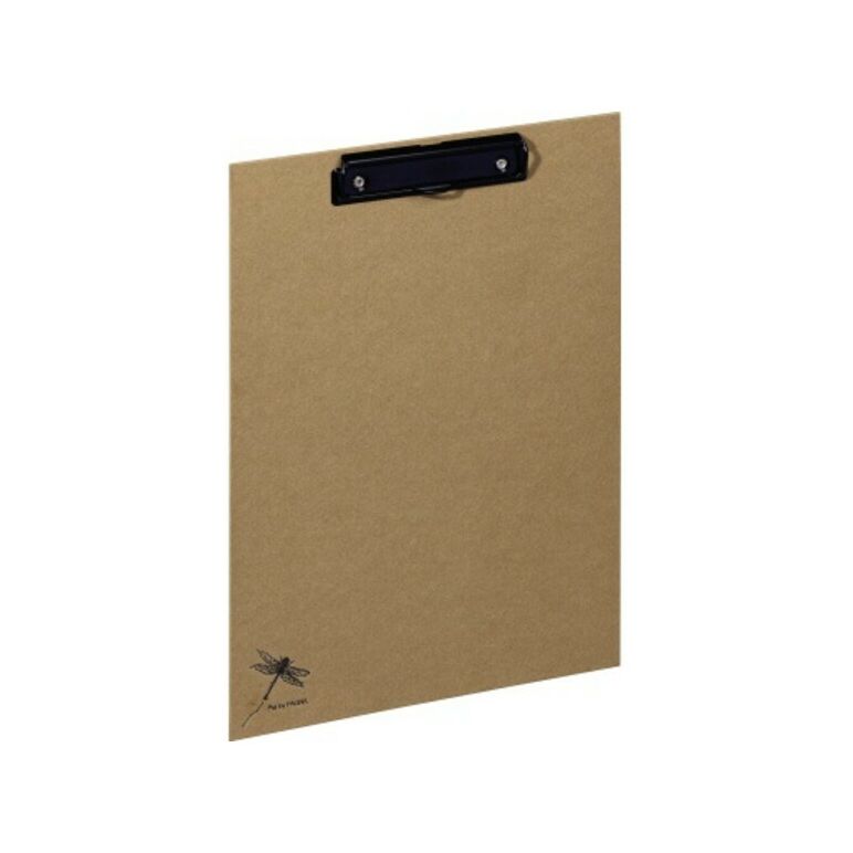 Stabiler Rücken für bequemes Schreiben ohne Unterlage. Mit Klemmmechanik für lose Dokumente und hochwertiger schwarzer Prägung einer Libelle.