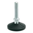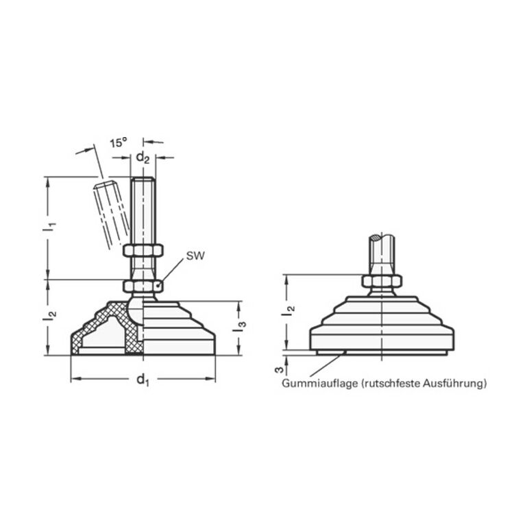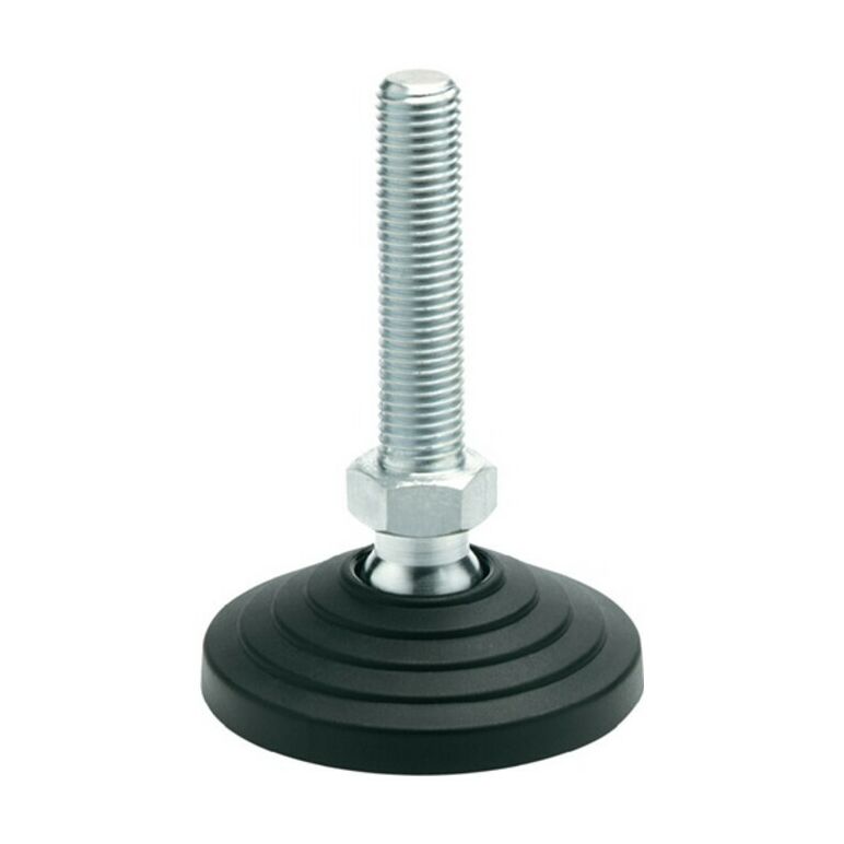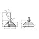 mit Mutter, mit Gummiauflage · die in der Tabelle angegebenen Werte der statischen Belastbarkeit sind Richtwerte, bei deren Überschreitung es zur bleibenden Verformung bzw. zum Bruch des Kunststofftellers kommen kann · Ausführung: Fuß Kunststoff Thermoplast (Polyamid PA), glasfaserverstärkt, schwarz, matt, temperaturbeständig bis 100 °C · Verstellspindel Stahl verzinkt, blau passiviert · Festigkeitsklasse 5.8 · Sechskantmutter ISO 4032: Stahl verzinkt, blau passiviert · Gummiauflage (NBR): 70 Shore A, schwarz Weitere technische Eigenschaften: · l3: 24mm · l2: 33mm · l1: 98mm · d1: 80mm · d2: M 12mm