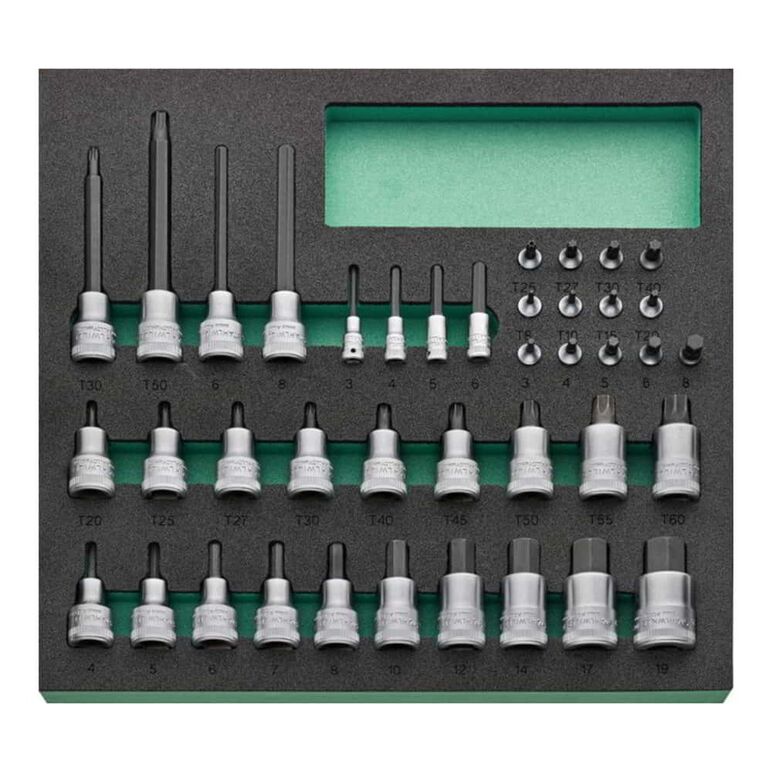 Eigenschaften:Werkzeugsortiment im Werkzeugeinlagen-Baukastensystem Tool Control System (TCS) - Sicherheit integriertAlle Vorteile auf einen Blick:Beim Tool Control System liegen die Werkzeuge in chemikalienbeständigen Sicherheits-Schaumeinlagen mit hochpräzisen, dreidimensionalen AusschnittenSignalfläche gelb. Zur Überprüfung der Vollständigkeit genügt ein Blick: »Gelb« bedeutet, es fehlt WerkzeugLieferumfang:9 Schraubendrehereinsätze TORX® 1/2" Nr. 54 TX : T20 | T25 | T27 | T30 | T40 | T45 | T50 | T55 | T6010 Schraubendrehereinsätze für Innensechskantschrauben, 1/2" Nr. 54 : 4 | 5 | 6 | 7 | 8 | 10 | 12 | 14 | 17 | 19 mm2 Schraubendrehereinsätze für TORX®, 1/2" Nr. 1054 TX : T30 | T502 Schraubendrehereinsätze für Innensechskantschrauben, 1/2" Nr. 1054/2054 : 6 | 8 mm4 Schraubendrehereinsätze für Innensechskantschrauben, 1/4" Nr. 44 : 3 | 4 | 5 | 6 mm8 Schraubendrehereinsätze für TORX®, 1/4" Nr. 44 KTX : T8 | T10 | T15 | T20 | T25 | T27 | T30 | T405 Schraubendrehereinsätze für Innensechskantschrauben 1/4" Nr. 44 K : 3 | 4 | 5 | 6 | 8 mm