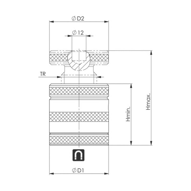 mit flacher Auflage und Magnetfuß · Spindel: Trapezgewinde selbsthemmend, mit Endsicherung · Vergütungsstahl, lackiert · mit dem Permanent-Magnet kann eine exakte Positionierung des Werkstückes in vertikaler Stellung erreicht werden · Ø-Angabe = ohne Magnetfuß · Weitere technische Eigenschaften Tragfähigkeit max.: 100kN · Zentrierloch-Ø: 12mm · H max.: 110mm · D2: 50mm · TR: 30 x 4mm · H min.: 80mm · D3: 55mm · D1: 50mm