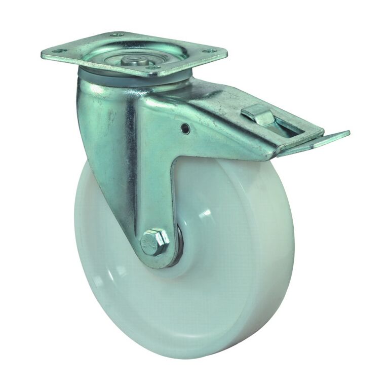 Eigenschaften:Schwerlastlenkrollen mit FeststellerKunststoffrad,KugellagerPlatte