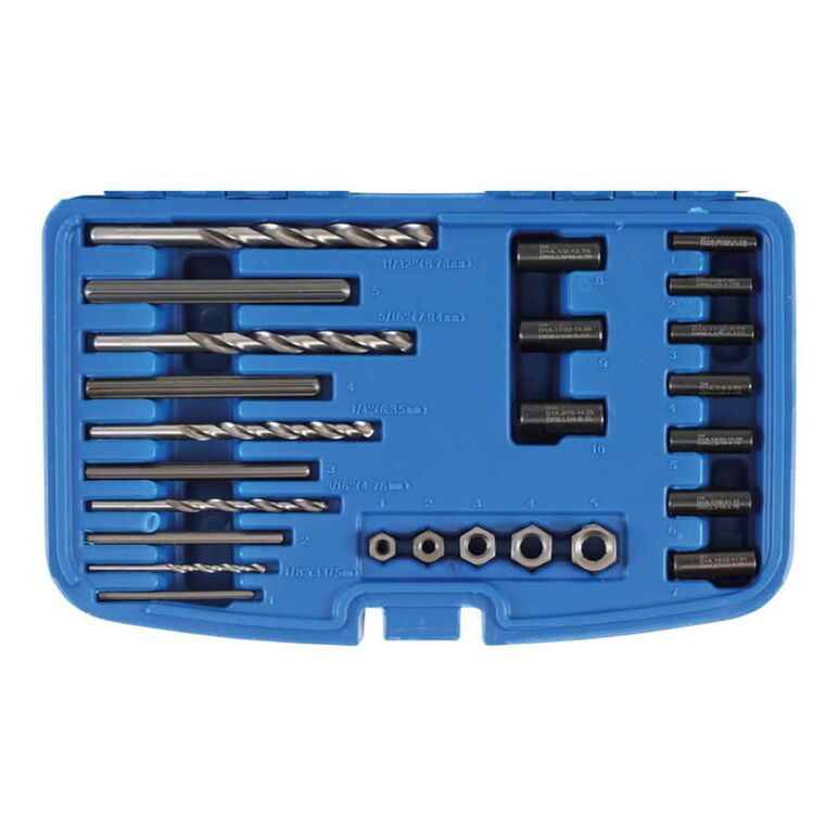 Eigenschaften:Ermöglicht ein professionelles Herausdrehen von abgebrochenen Schrauben und StehbolzenMindert den Zeit- und KostenaufwandHSS-Stahl5 HSS Bohrer 3,2 - 4,8 - 6,4 - 8,0 - 8,7 mm10 Bohrer-Führungsbuchsen5 Ausdrehbolzen5 Ausdrehadapter