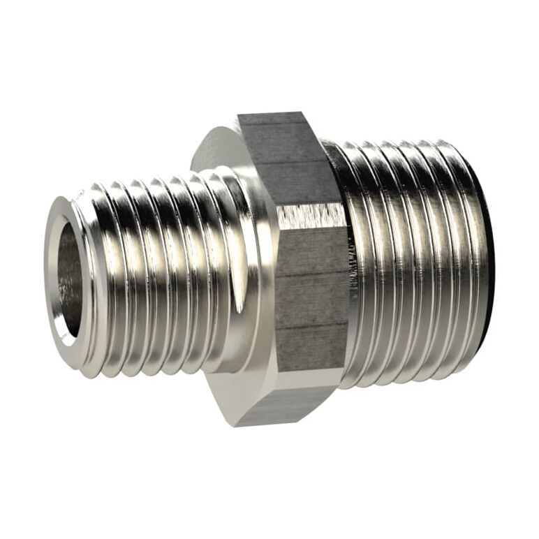 - Doppelgewindenippel, R 3/8 a., R 1/2 a., SW 22, Messing vernickelt, Arbeitsdruck max. 25 bar, Betriebstemperatur max. 150 °C