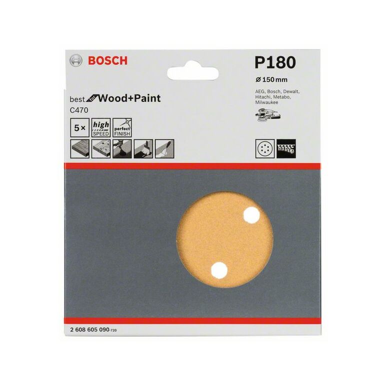 Bosch Schleifblatt C470 für Exzenterschleifer, 150 mm, 180, 6 Löcher, Klett, 5er-Pack (2 608 605 090)