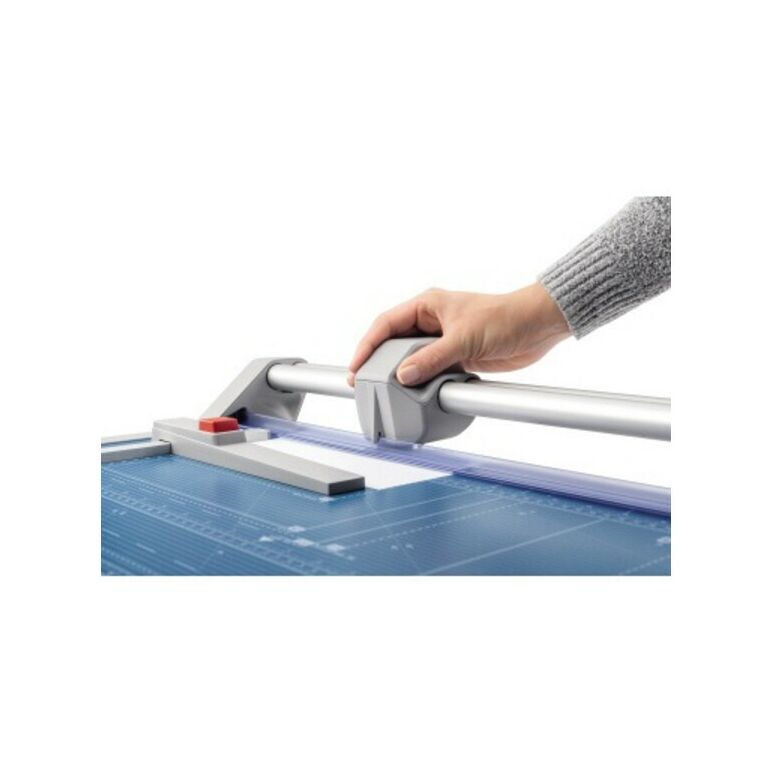 Komfortabler Rollenschneider für den professionellen Einsatz. Stabiler Tisch mit rutschfesten Gummifüßen für einen sicheren Stand. Formatlinien auf dem Tisch mit mm-Teilung entlang der Schneidkante erleichtern die Ausrichtung des Schnittgutes. Geschliffenes Rundmesser für präzise und gratfreie Schnitte. Geschliffenes Untermesser für exakte Ergebnisse. Hochwertige Messer aus gehärtetem Stahl für langanhaltende Schnittqualität. Rundmesser im geschlossenen Kunststoffkopf gewährleistet ein Höchstmaß an Sicherheit. Automatische Pressung an der Schnittstelle für eine schnelle Fixierung des Schnittgutes. Zwei Winkelanlagen. Verstellbarer Rückanschlag zur schnellen Formatfindung. Rückseitige Standfüße für eine platzsparende · stehende Unterbringung am Arbeitsplatz.