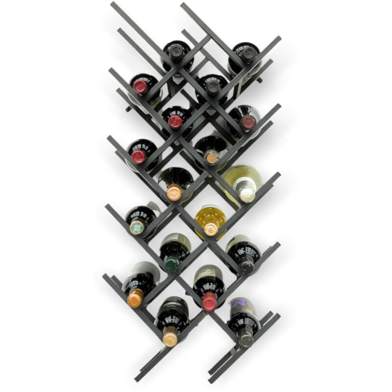 Weinregal 2er Set für die Wandmontage Acord mit Platz für 18 Flaschen. Aus Metall geschmiedet und pulverbeschichtet in der Farbe Schwarz. Mit abgerundeten Ecken an den Flaschenablagen. Die Flaschen können einfach in die dafür vorgesehenen Ablagen eingelegt werden, durch die waagerechte Lagerung wird das Austrocknen des Korkens verhindert und somit das Eindringen von Luft. Das Weinflaschenregal kann vertikal (oben / unten), sowie horizontal (links / rechts) beliebig oft erweitert werden. Ideal als Geschenk für Weinliebhaber und ein Blickfang in jedem Esszimmer, Wohnzimmer, Küche, Keller oder Weinkeller. Maße: Höhe 82 cm, Breite 23 cm, Tiefe 25 cm Gewicht: 2 kg / Stück Das Flaschenregal wird inkl. Befestigungsmaterial geliefert, welches verdeckt hinter den eingelegten Weinflaschen montiert wird. Der sichere Halt an der Wand erfolgt jeweils mit zwei schwarzen Schrauben an der Ober - und Unterseite. Das Regal wird aus 12 mm Vierkantrohr hergestellt. Handarbeit aus der EU - geschmiedetes