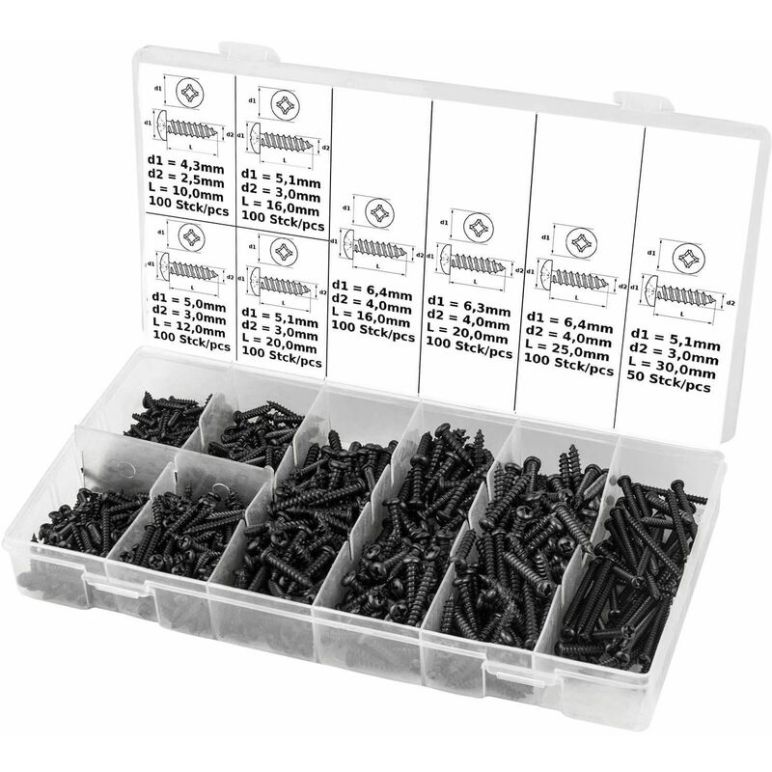 Linsen Blechschrauben Sortiment 750tlg. Original DEMA Linsen Blechschrauben Set 750tlg. Gehört in JEDE Werkstatt und JEDEN Haushalt. Finden Sie übersichtlich und schnell die benötigte, passende Länge. Klein und kompakt passt das Set in jede Schublade. Ausstattung: Sortimentkoffer mit Schnappverschluss Umfangreich Übersichtlich Hochwertig Alle Schrauben schwarz brüniert Normale Kreuzschlitzaufnahme Schrauben-Größenangabe separat im Kastendeckel Inhalt: 750 Stück 8 verschiedene Größen (Stück/Durchmesser/Länge): 100x 2,5x10 / 100x 3x12 / 100x 3x16 / 100x 3x20 / 100x 4x16 / 100x 4x20 / 100x 4x25 / 50x 3x30 mm Sortierkastengröße LxBxH: 21x11x3 cm Gesamtgewicht: 750 g