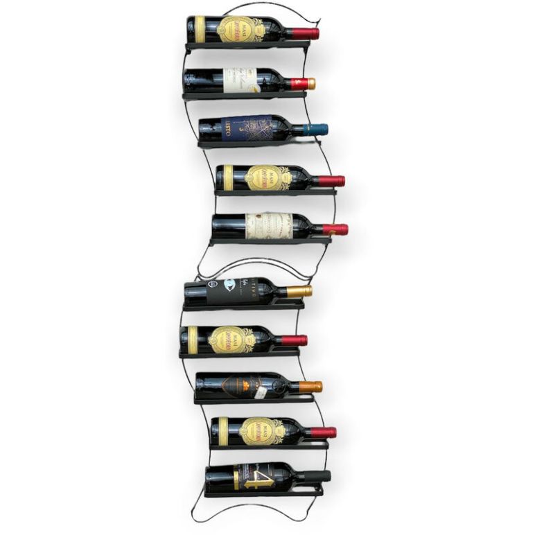 Weinregal 2er Set für die Wandmontage Lento mit Platz für 10 Flaschen. Aus Metall geschmiedet und pulverbeschichtet in der Farbe Schwarz. Mit abgerundeten Ecken an den Flaschenablagen. Die Flaschen können einfach in die dafür vorgesehenen Ablagen eingelegt werden, durch die waagerechte Lagerung wird das Austrocknen des Korkens verhindert und somit das Eindringen von Luft. Das Weinflaschenregal kann vertikal (oben / unten) beliebig oft erweitert werden. Ideal als Geschenk für Weinliebhaber und ein Blickfang in jedem Esszimmer, Wohnzimmer, Küche, Keller oder Weinkeller. Maße: Höhe 64 cm, Breite 36 cm, Tiefe 8 cm Der Innenabstand der Flaschenablagen beträgt 10 cm Gewicht: 1,8 kg / Stück, Gesamt 3,6 kg Die Flaschenregale werden inkl. Befestigungsmaterial geliefert, welches verdeckt hinter den eingelegten Weinflaschen montiert wird. Der sichere Halt an der Wand erfolgt jeweils mit zwei schwarzen Schrauben an der Ober - und Unterseite.