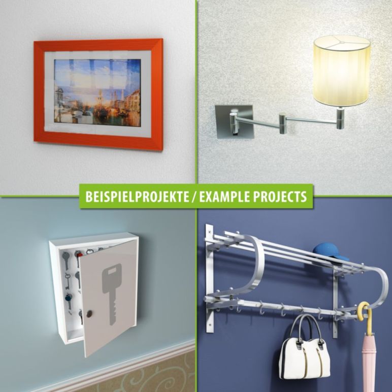 • Galvanisch verzinkter Metallhohlraumdübel mit Dübelkappe, Drehsicherungen und metrischer Schraube mit Sechskant- (SW 13) bzw. Schlitz- und Kreuzschlitzantrieb