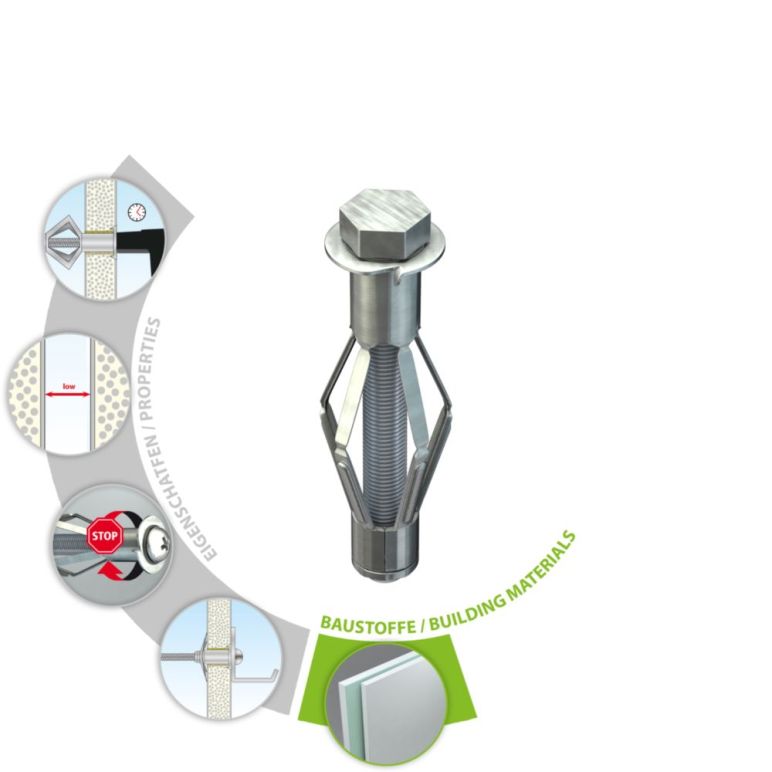• Galvanisch verzinkter Metallhohlraumdübel mit Dübelkappe, Drehsicherungen und metrischer Schraube mit Sechskant- (SW 13) bzw. Schlitz- und Kreuzschlitzantrieb
