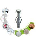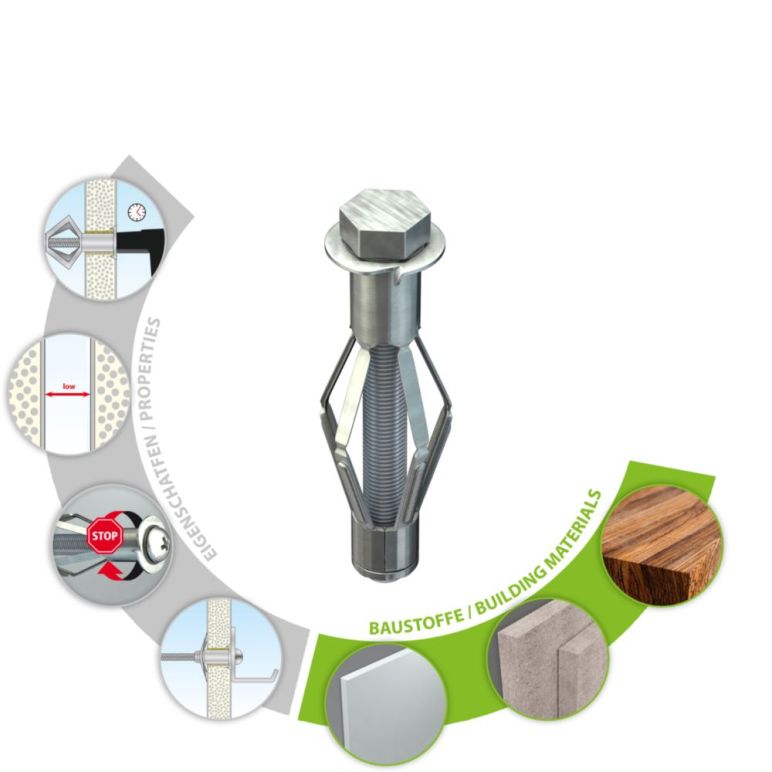 • Galvanisch verzinkter Metallhohlraumdübel mit Dübelkappe, Drehsicherungen und metrischer Schraube mit Sechskant- (SW 13) bzw. Schlitz- und Kreuzschlitzantrieb