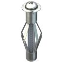 • Galvanisch verzinkter Metallhohlraumdübel mit Dübelkappe, Drehsicherungen und metrischer Schraube mit Sechskant- (SW 13) bzw. Schlitz- und Kreuzschlitzantrieb